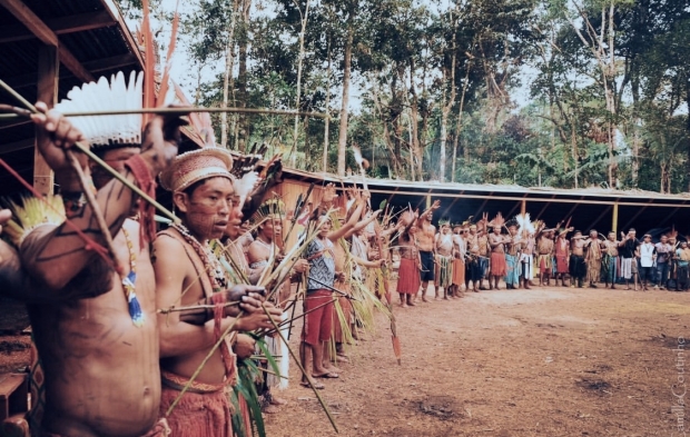 Serpentes, jacarés e outros animais, além dos homens da floresta, fazem parte das histórias contadas pelo Mahku, grupo fundado em 2012 e formado por indígenas do povo Huni Kuin, que vive na fronteira entre o Acre e o Peru. Um dos símbolos do imaginário pictórico do Mahku ganhou destaque na exposição – o imenso jacaré do mito Kapewë Pukeni que, na língua desse povo, significa jacaré-ponte. Diz a lenda que o animal era uma espécie de guardião ou ponte entre os dois continentes que havia quando a Terra estava na era da Pangeia.